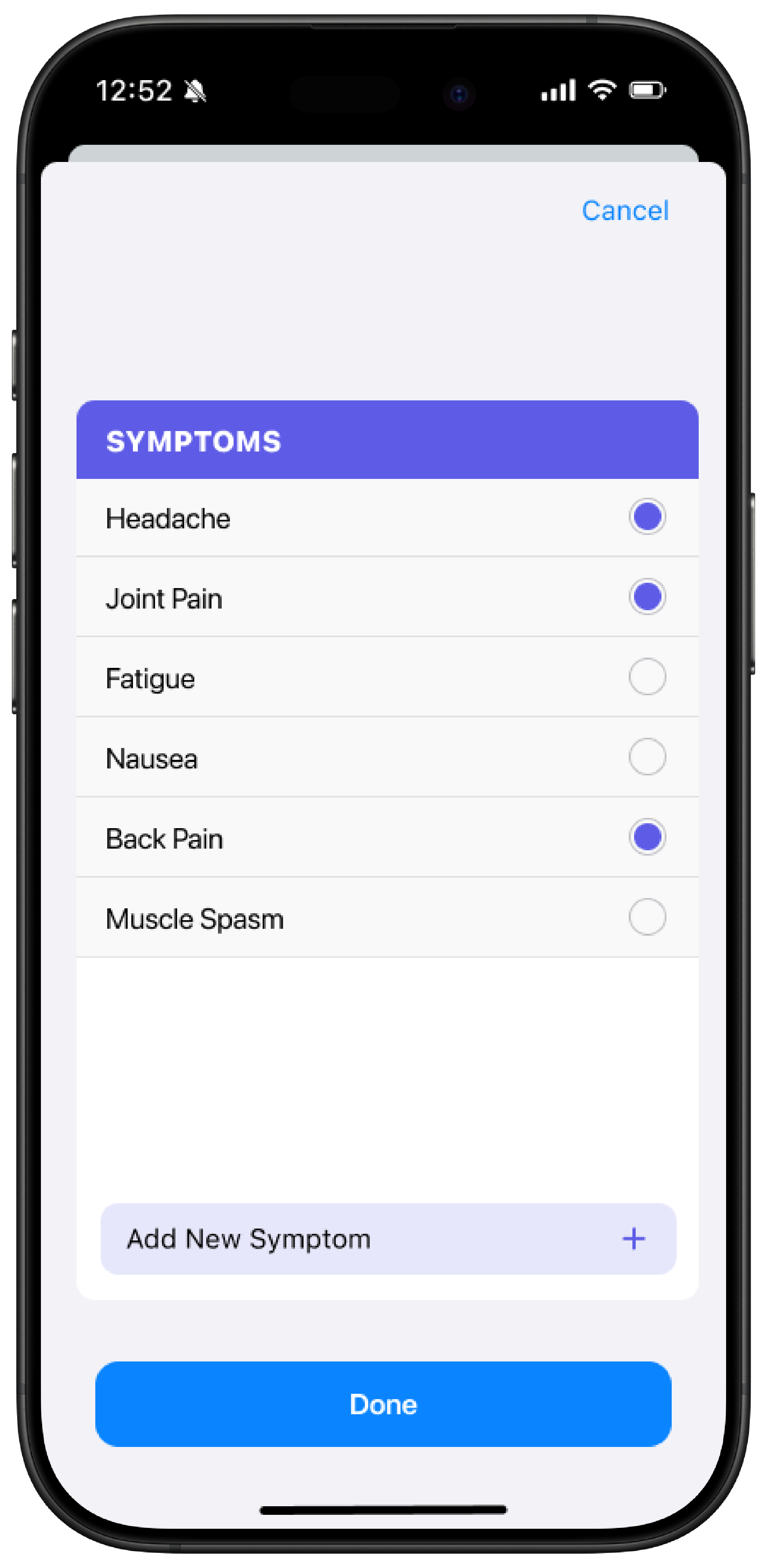 Cycle tracking feature of Apple Health enables user to log symptoms from a predetermined list.